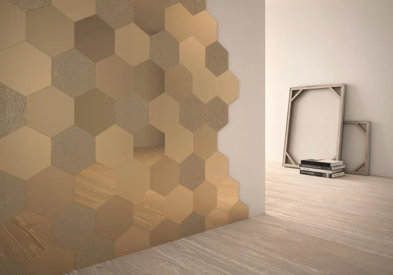 Una buena opción para conseguir una pared elegante y actual, es cubrirla con piedras naturales o porcelánicos en colores neutros y dar el toque con elementos geométricos en dorado, esta idea se empieza a ver en espacios públicos como: restaurantes, hoteles o incluso en algunas oficinas.